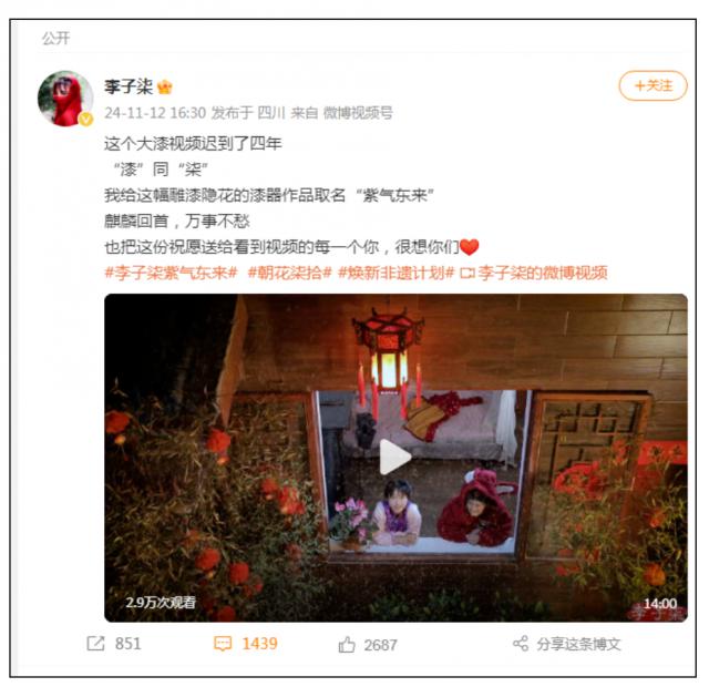 11 月 12 日本,李子柒回归的消息冲上热搜第一。李子柒发布微博:这个大漆视频迟到了四年,“漆”和“七”一样。这个漆器作品被命名为“紫气东来”。麒麟回头一看,把这个祝福送给每一个看过视频的人。我非常想念你。(详情请点击:970 水果糖)