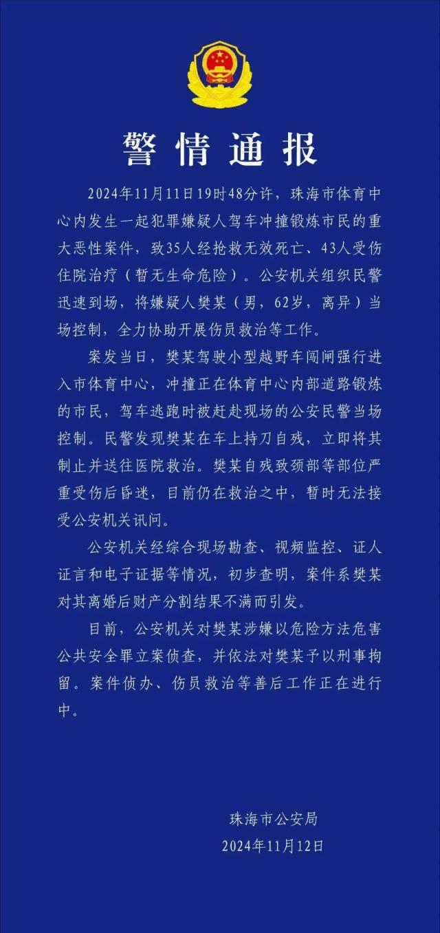●珠海市民重大恶性案件的驾驶撞击造成 35 人死亡 43 人受伤
