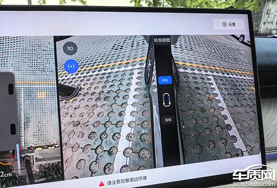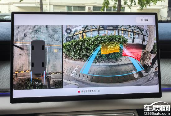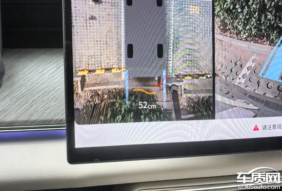 测试车配有透明底盘 /540 度图像支持多角度显示。实际测量显示,在白天阳光充足的情况下,画质清晰度表现良好,颗粒感较轻。画面边缘有畸变,但水平不严重。图像中不仅有随机的倒车辅助线,还可以实时同步与障碍物的距离,可以为驾驶员提供参考,实用性强。