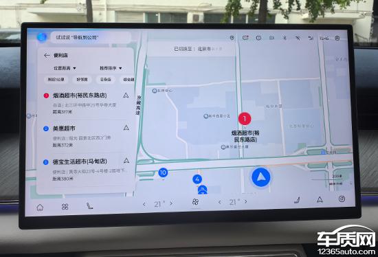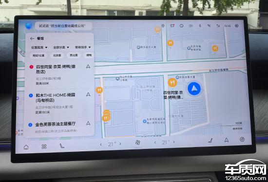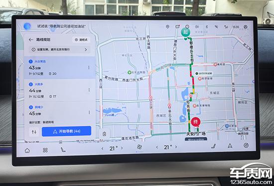 高德内置评价车 LION 版本,根据名称不难看出,这是系统定制版的高德地图。从实际测量来看,其主观使用体验与一般版本的高德地图相似,界面布局依然熟悉。搜索框位于左上角,提供多种输入方式。目的地确定后,导航会提供三种选择,基于车联网,可以实时同步路线的拥堵,非常直观。