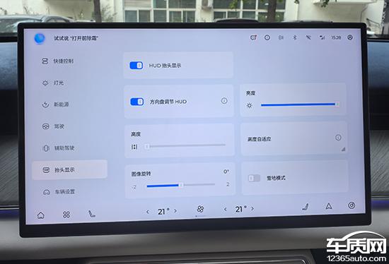 HUD 抬头数字显示面积适中,清晰度和内容丰富度相对较好。在中控面板的控制页面下,不仅可以打开或关闭。 HUD 抬头显示,还可以详细设置显示高度、亮度和内容,包括图像旋转和雪地模式。此外,用户可以直接通过方向盘的多功能按钮进行调整 HUD,操作简便。