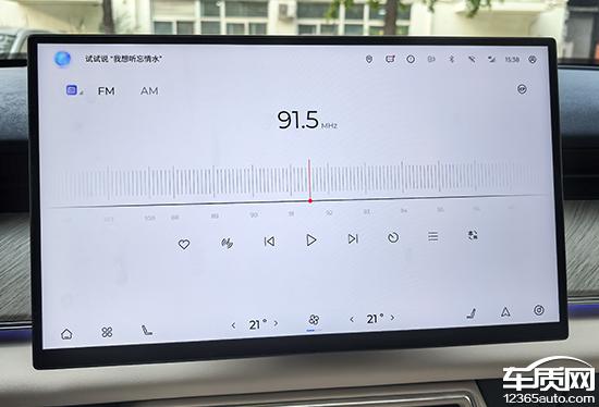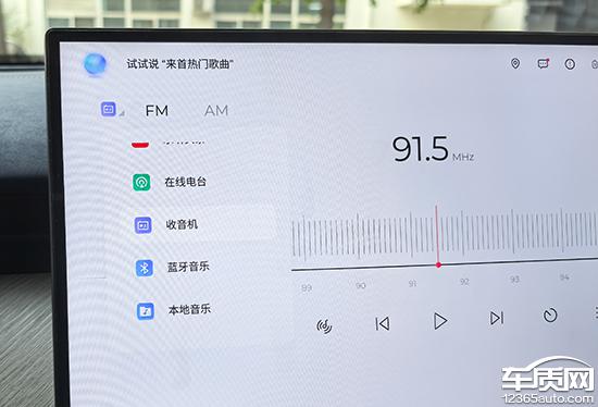 多媒体部分,系统提供原生产品 FM/AM 广播可以通过语音系统打开或关闭。收音机界面布局简单合理。如果你想收集广播电台,点击“桃心”将其存储在收藏夹中。此外,音频可以通过左上角的功能栏快速选择,包括在线广播电台、蓝牙音乐和本地音乐,交互逻辑简单明了。