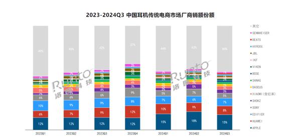 【CNMO 科技消息】11 月 13 日,洛图科技(RUNTO)根据《中国耳机零售市场月度跟踪报告》的数据,2024 2008年第三季度,中国传统耳机在线电商平台销量达到 2990 万副,同比增长 26.8%,销额 51.6 亿元,同比增长 20.8%。这个季度,传统电子商务市场 TOP15 品牌销售市场份额合计为 华为和小米共占55.6% 11.5%,漫步者、韶音等国产音频品牌占总数。 总市场份额超过外资的17.9%,达到 29.4%。
