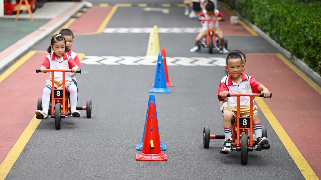 合肥市高铁南站幼儿园的孩子们正在玩自行车游戏。新华社 资料图