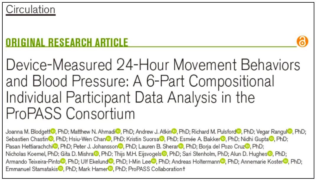 [1]Device-Measured 24-Hour Movement Behaviors and Blood Pressure:A 6-Part Compositional Individual Participant Data Analysis in the ProPASS Consortium.Circulation.doi.org/10.1161/CIRCULATIONAHA.124.06982