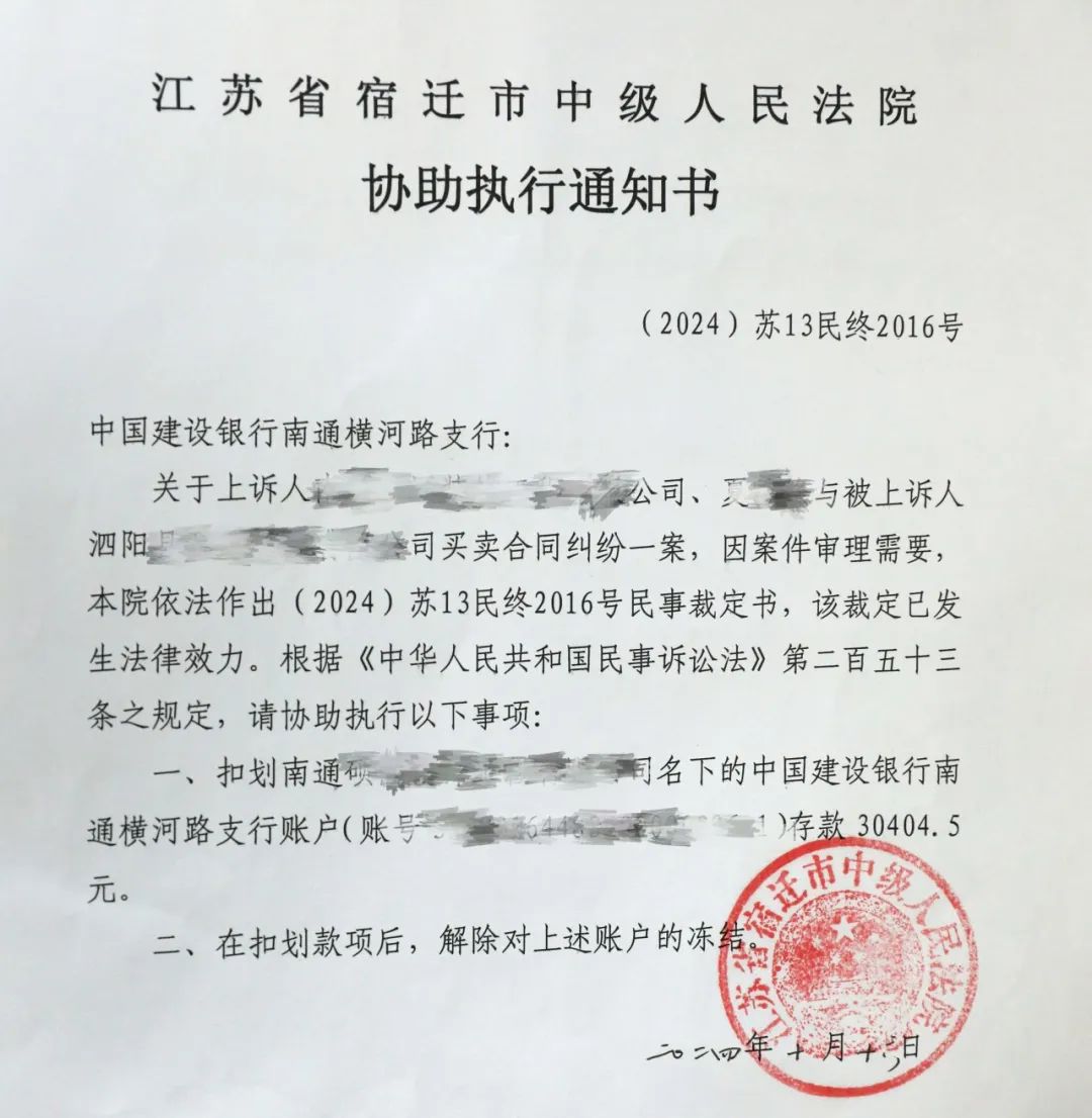 南通某企业从泗阳某公司购买建筑材料,南通某企业认为泗阳某企业销售的建筑材料存在质量问题,拒绝支付。泗阳某企业向泗阳县人民法院提起诉讼,申请财产保全,冻结了南通某公司的银行账户。