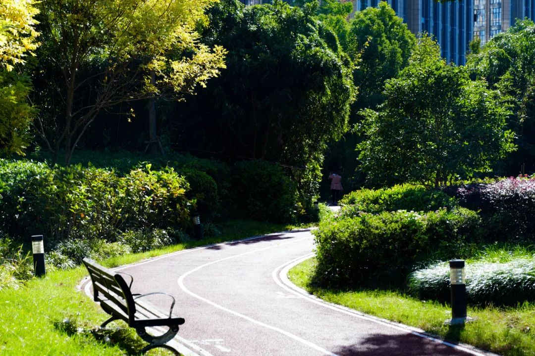 步道采用了今年流行的颜色——安可拉红。复古的红色步道蜿蜒穿过绿色群体,两侧增加了长椅和路灯,不仅是健身的好地方,也是邻居之间交流休息的共享空间。