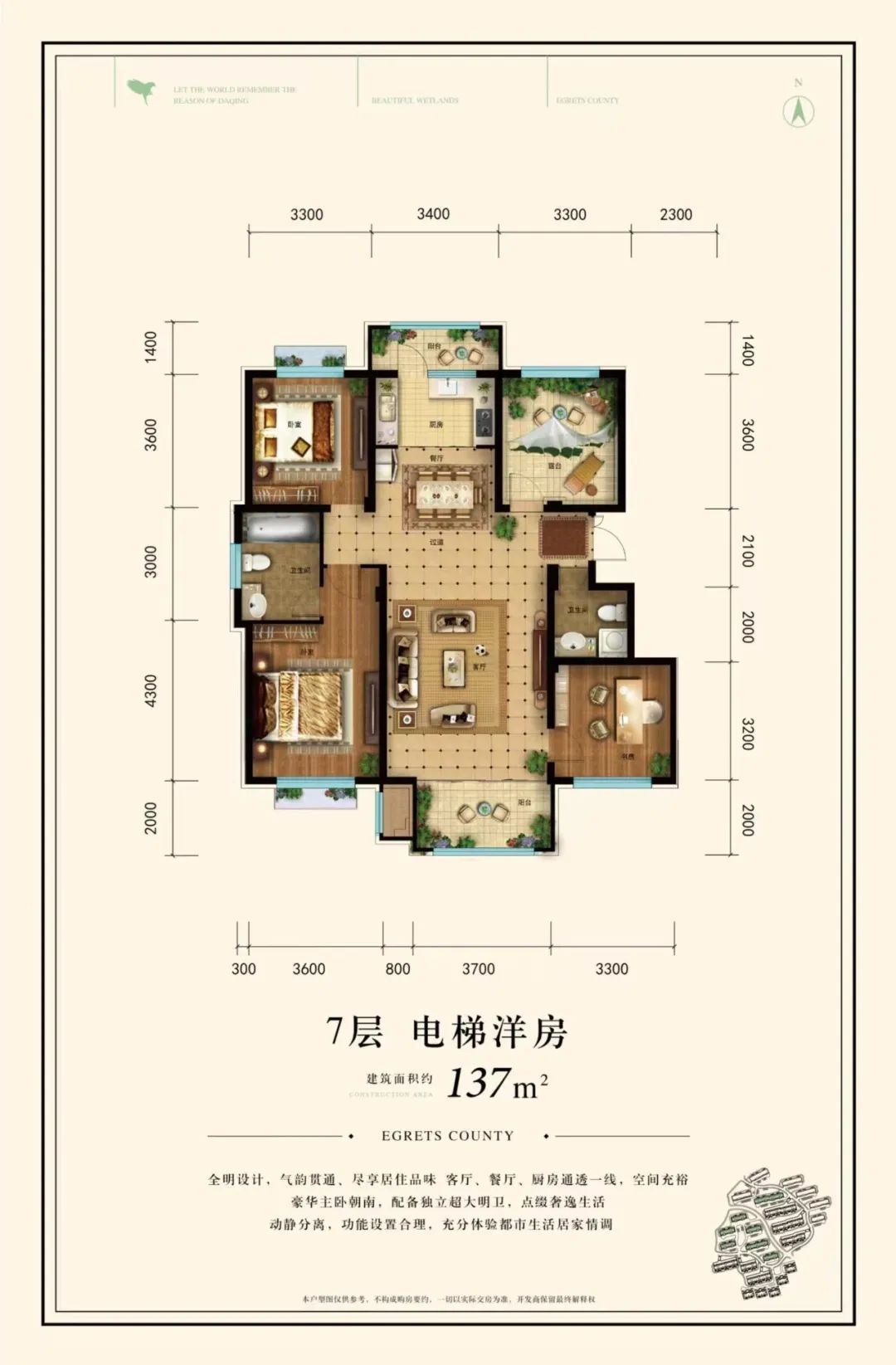 白鹭郡的容积率只有1.03,7F/8F电梯洋房、4F洋房和独栋别墅都有规划,建筑面积137。㎡-240㎡优质的生活空间,每一个房间都是精心策划的。7F、8F半封闭露台赠送了一半的面积,4F和别墅户外露台全部赠送,提高了业主的生活质量和使用面积。所有的房间都是南北通透的,层高3米。超大楼的距离给每栋房子带来了全天的光照。