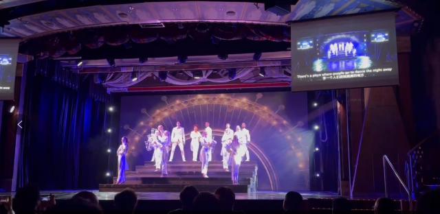 特别是这条船上的综艺节目水平非常在线,还记得两位外国歌星演绎的《金曲怀旧点唱机》,从格伦 · 米勒唱着猫王,让船上的叔叔阿姨们从 high 到狂 high。