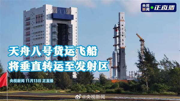 快科技 11 月 13 今天,天舟八号和长征七号船箭组合体将垂直转移到发射区域,及时发射。