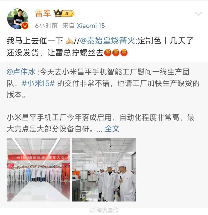 最近,“雷军真去拧螺丝了”登上微博热搜。这起因于一位网友对定制手机长时间未发货的调侃,他在微博上说自己定制的手机十几天了还没发货,戏称“让雷总去工厂拧螺丝去”。雷军随即回应“我马上去催一下”。
