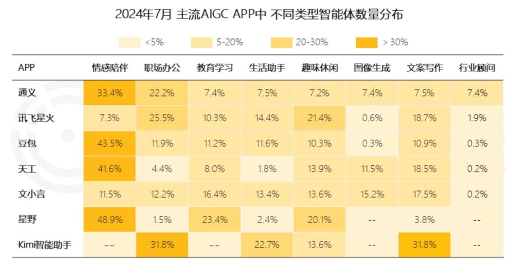 此前,AI智能体的B端应用多集中在代码编写、辅助创作方面,而在C端,则衍生出了面向用户的交友陪伴、心理咨询等智能体。截至今年7月,据QuestMobile统计,文案写作、职场办公和情感陪伴成为主流AIGC产品中智能体落地的常见方向。