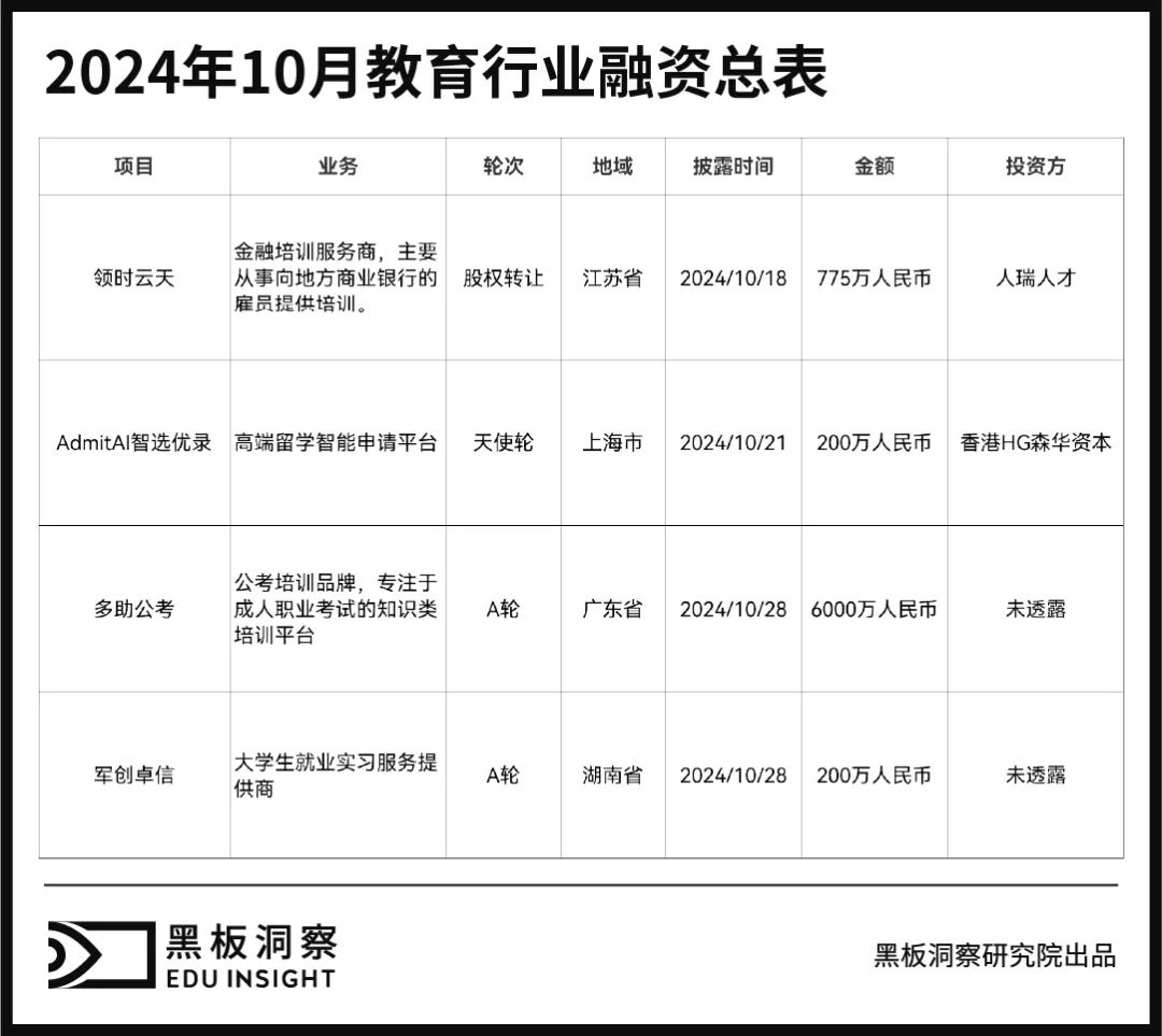 10月教育行业融资事件集中在职业教育和出国留学两大赛道,反映出市场对实用型教育和国际教育需求的持续关注。职业教育凭借政策红利和社会需求,正成为资本布局的重点领域。而出国留学的融资则表明,国际教育市场逐步复苏,新的增长机会正在酝酿。整体来看,教育行业的资本流向凸显出对细分市场潜力的精准把握,也预示着行业在多元化发展中的新格局正在形成。