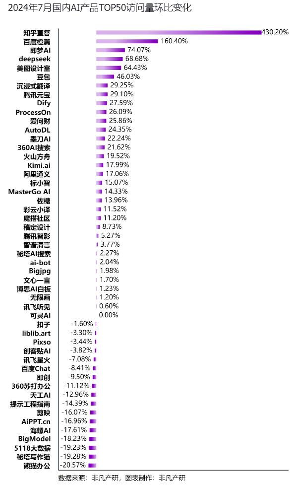 也确实有公司通过AI搜索产品获得了不错的运营效果,根据非凡产研数据显示,知乎6月发布“知乎直答”,该产品用户访问量7月环比达到惊人的430.2%,增速位列国内AI产品TOP 50第一。