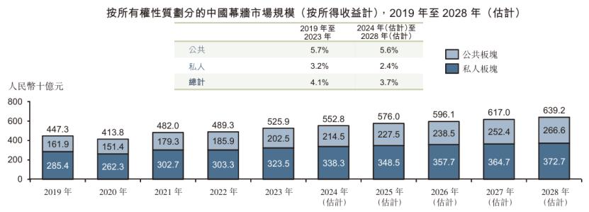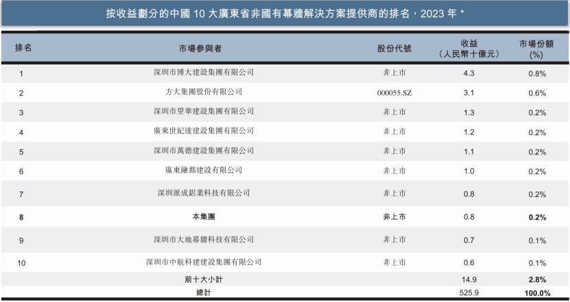2023年,按幕墙工程总收益计,中国10大幕墙工程承造商占总市场份额的约8.0%,这表明整体幕墙工程市场相对分散。