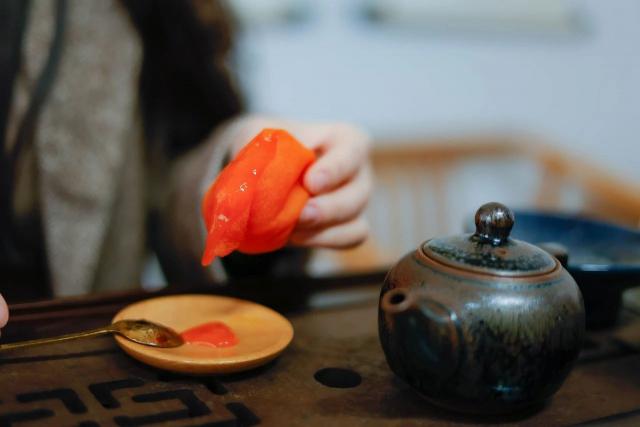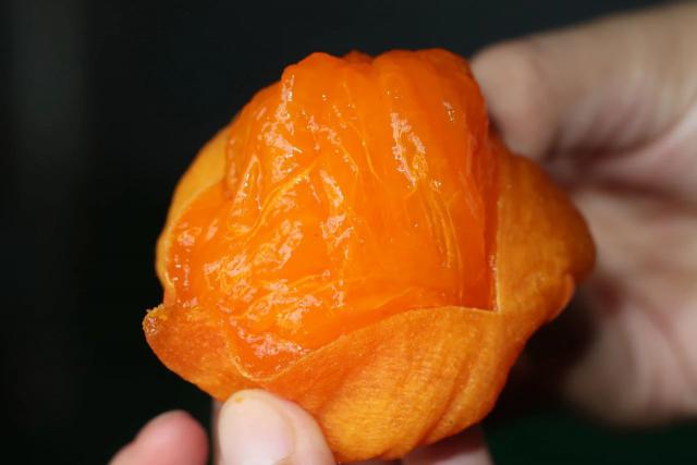 浓浓的柿肉像果酱一样丝滑。,偶尔还可以吃一些果冻状的柿子舌。