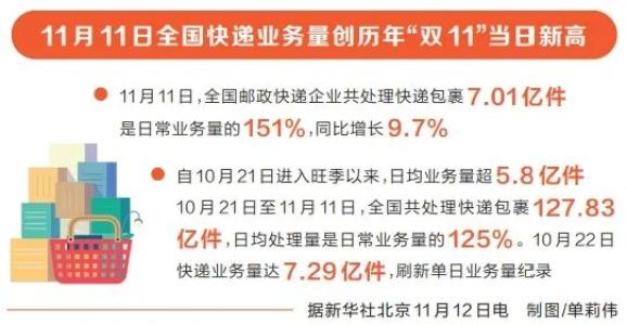 今年快递服务旺季时间长,战线长。自10月21日进入旺季以来,截至11月11日24时,全省邮政快递行业已收到6.35亿件快递包裹,日均业务量达到2885万件。在这些包裹中,10月22日收到了3391万件快递包裹,创下了单日业务量的新纪录。