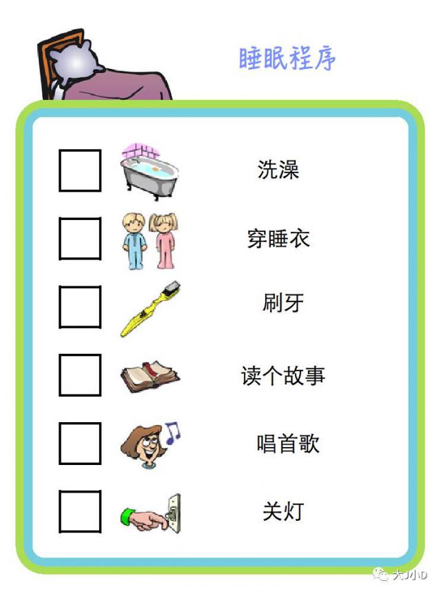 后来她长大了,我们做了睡前程序表,在表格中画出了睡前需要她自己做的一切,提醒她按照程序一个一个完成。