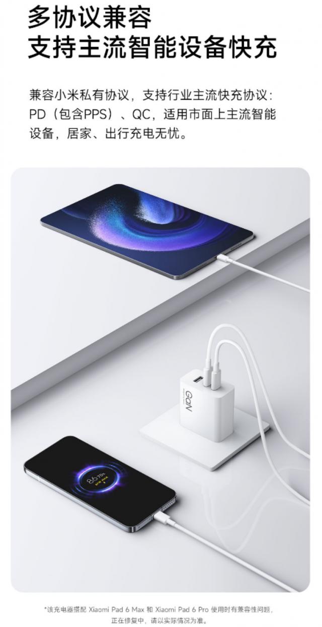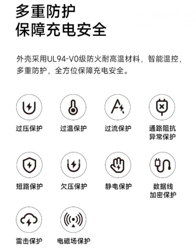 该充电器适用于小米私人协议,支持 PD(包括 PPS)、QC 行业主流快充协议;选择充电器外壳 UL94-V0 一级防火耐高温材料,支持智能温度控制,多重保护。