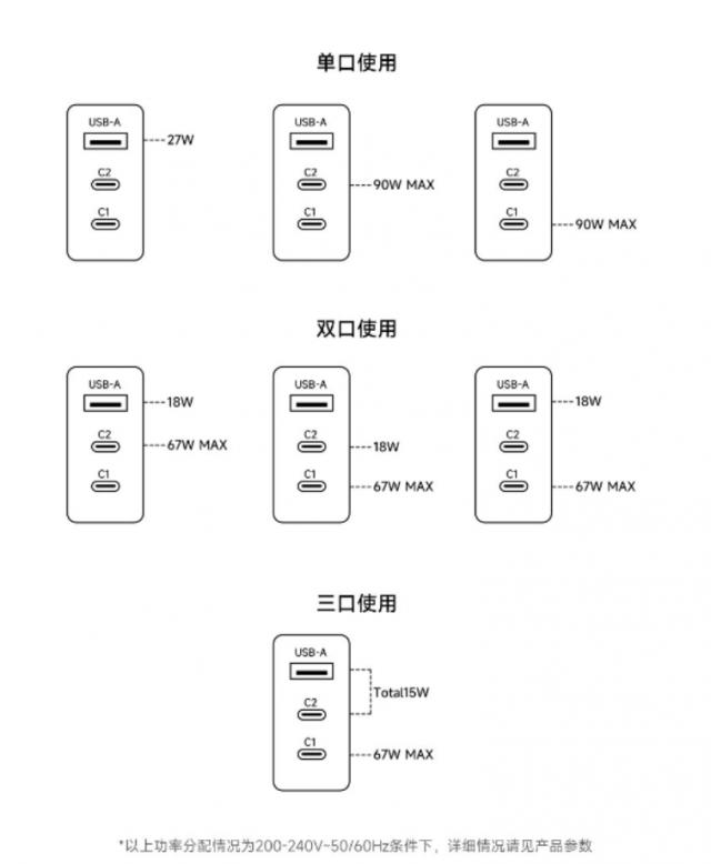 小米,据报道 90W GaN 三个充电器套装随意 Type-C 最大限度地实现单口 90W 功率输出;双口随意使用,均可导出最大限度。 67W 18W 充电功率;三口可以同时导出 67W Max(USB-C1) 15W(C2 A)功率。