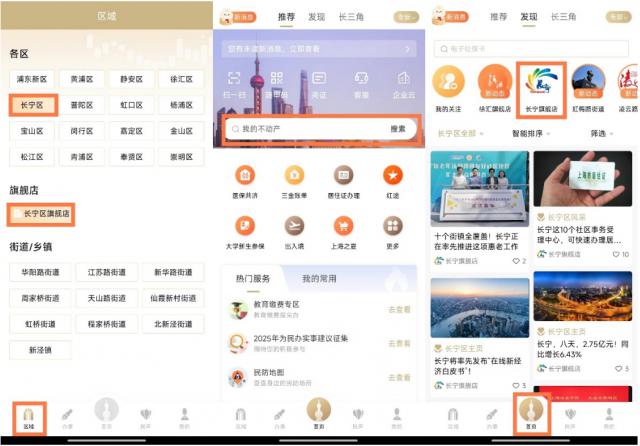 1、下载或打开“随申办市民云” APP(微信,支付宝小程序端都可以):点击左下角“区域”在申请首页,选择“长宁旗舰店”,进入区旗舰店首页;或者直接从输入框中输入“长宁区旗舰店”点击搜索。进入首页后,建议点击右上角的“关注”随时关注长宁区的动态细节,以后可以在首页的“发现”频道“我的关注”板块找到。点击图标或“进入首页”快速进入区旗舰店首页。