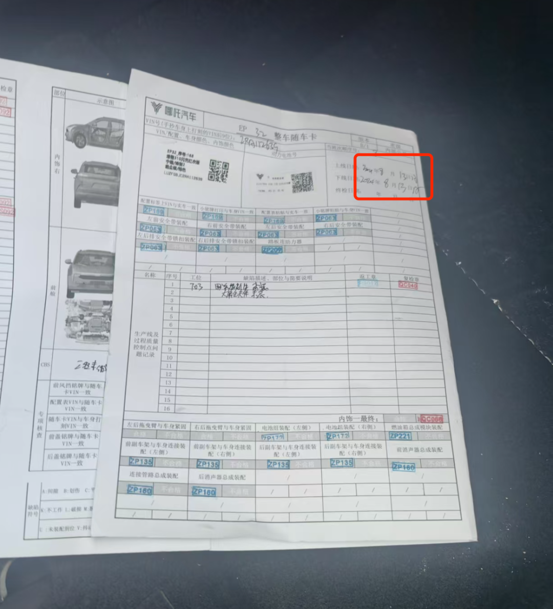 临近观察,凌乱的“工单”散落在车内,超过四分之一是未安装的“半成品”。有的没有安装座椅和仪表盘,有的前后保险杠和横梁总成,有的没有安装大灯、内饰板或中控台。...根据分散的工单,这些汽车的一般下线时间是今年8月。、九月份,可以看出,线下时间大多超过2个月,少数车型大约3个月。「库龄」。