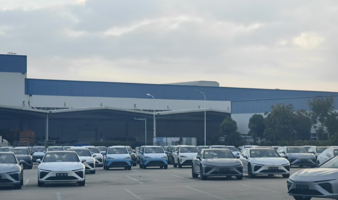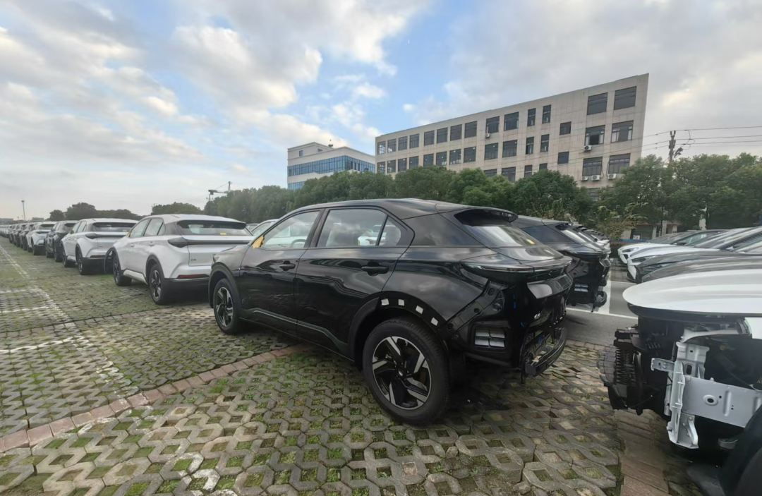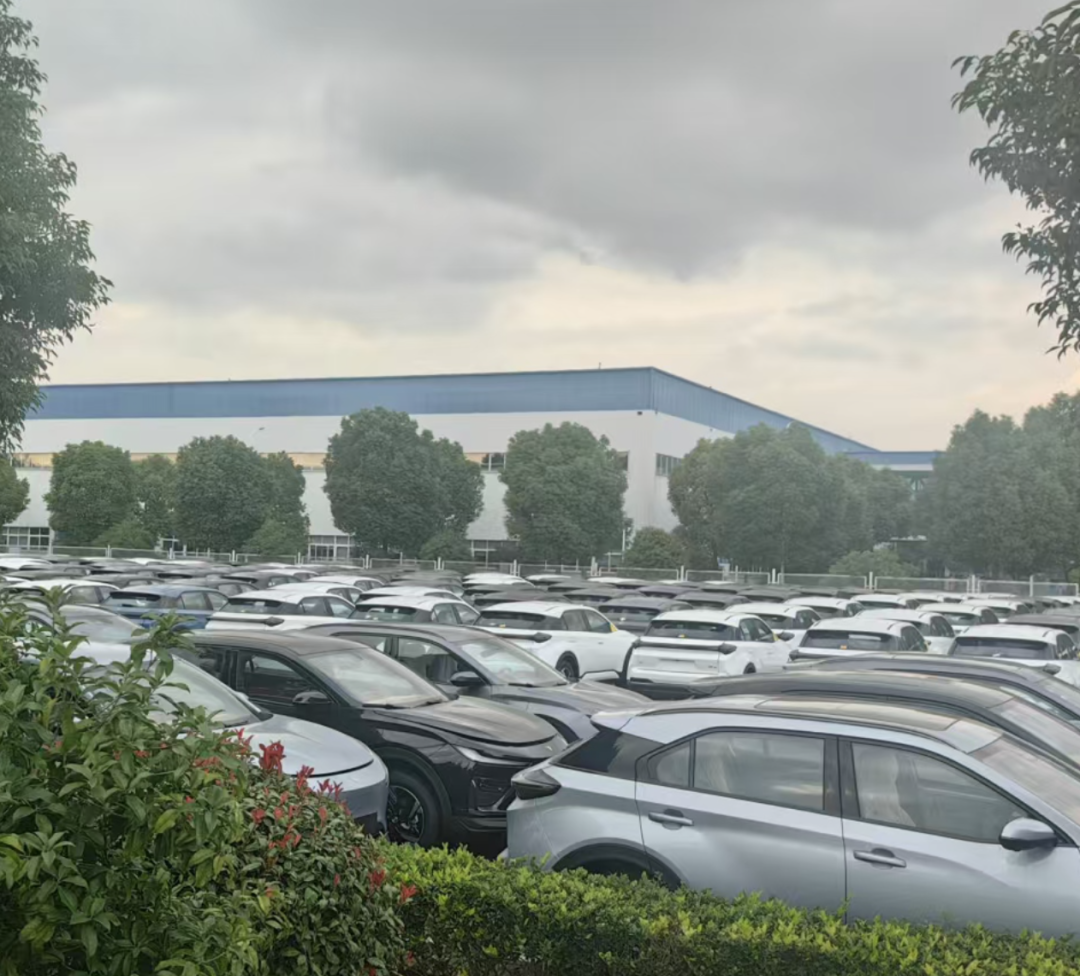 与空荡形成对比的是,围绕工厂的几个区域累计停放超过6个。、7000辆尚未上路的“新车”。在这些停车点中,少的7、8辆,多的15、一排停放6辆,2辆、30辆车排列摆放方式,整齐地停放在工厂周围的停车场、空地、公园附近约5个、在六个停车点中。