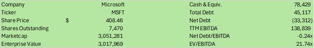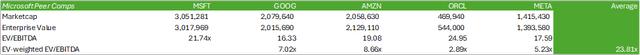 目前,微软股价低于其同行超大型公司的企业价值加权 EV/EBITDA 23.81 倍和 21.74 倍。为获得这一平均值,每个公司的倍数都是根据各自的企业价值加权,并根据规模标准化平均倍数。