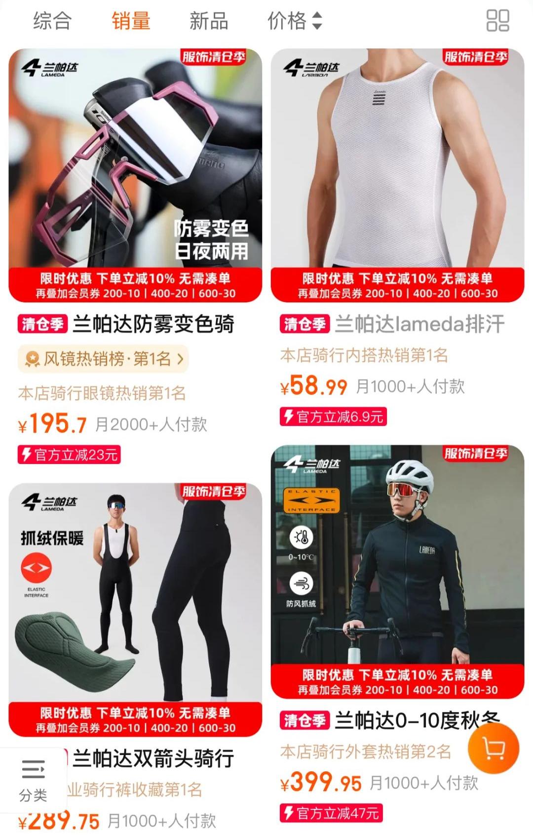 国产骑行服品牌兰帕达今年双十一(LAMEDA)于是相继推出「满300减50」「每次叠加一件打九折」其他强大的营销活动赢得了许多消费者的青睐。预购情况在骑行服装和装备类别中获得了规模和增长率。「双料第一」。此外,Castelli、MBO等品牌,也都取得了一定的增长。