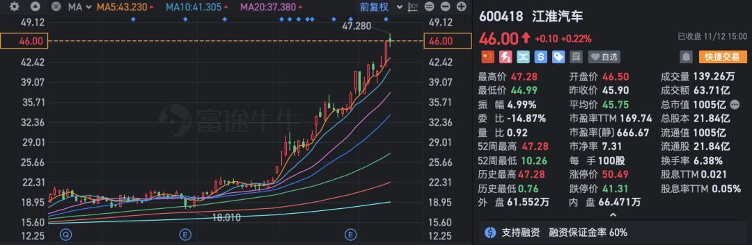 汽车东西11月12日消息,就在刚才,江淮汽车股价继续飙升,收盘价46元,市值达到1005亿元。而且站在1000亿元的市值上,江准只用了两个月。