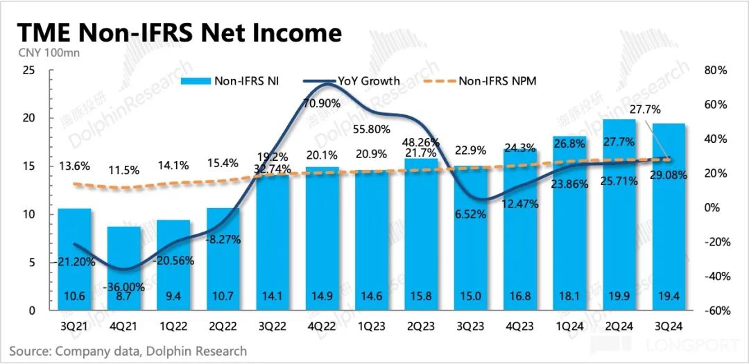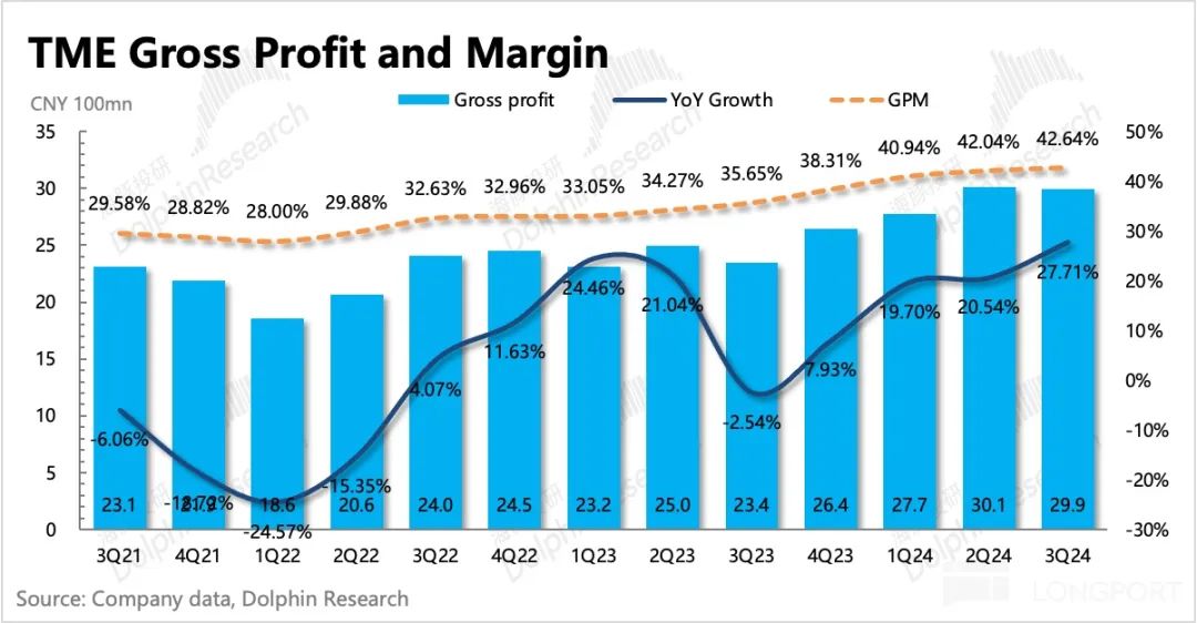 顺口一提,虽然整体盈利水平 inline,但结合低毛利率社交音乐收入超出预期的情况,隐含在线音乐的利润率水平应该由海豚君粗略计算,网络音乐的毛利率将继续上升。虽然增幅不大,但方向反映了海豚君之前提到的。腾讯音乐可以借助产业链议价的优势,稳步优化上游成本的逻辑。