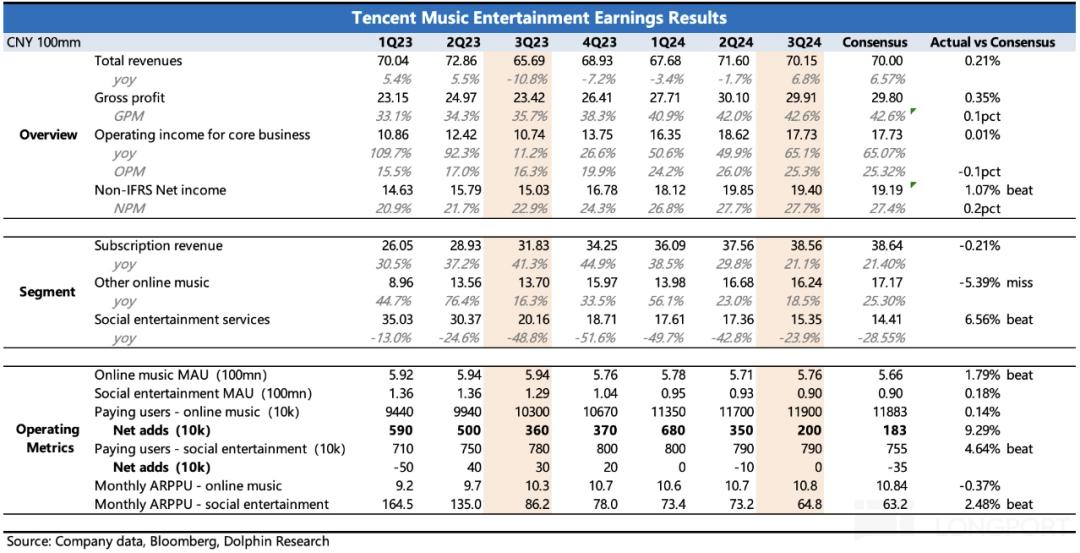 2. 现场直播加速走过伤痛调节:第三季度,社交娱乐正在慢慢走过调节痛苦,收入同比下降。 24%,开始明显收敛。与市场预测相比,社交娱乐的增长表现略好,但腾讯音乐的核心逻辑早已转化为音乐订阅,所以海豚君认为,社交娱乐的 beat 估计不会给市场带来多少积极的反应。
