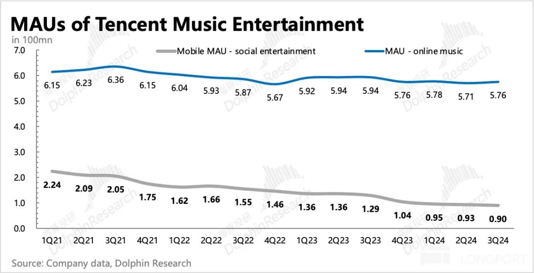 第三季度,腾讯音乐在线音乐月活环比增长 500 万至 5.76 亿。直播等社交娱乐也有整改的影响。虽然有旺季的加持,但社交娱乐的月活还是逐月下降。 300 万。
