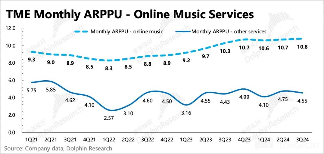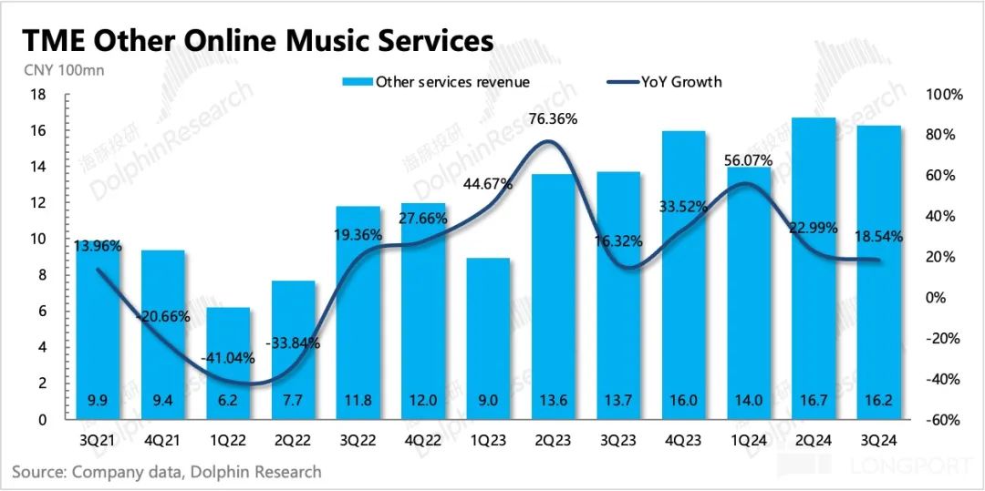 第一,订阅收入同比增长 21%,环比有所放缓。在这些人中,付费用户的数量( 16%yoy)以及人均支付金额( 4.9%yoy)增速略有放缓。截至第三季度末,音乐订阅付费渗透率达到 与第二季度相比,20.7%只增加了 0.2pct。公司的中长期目标是学习长视频水平, 25%~30%。