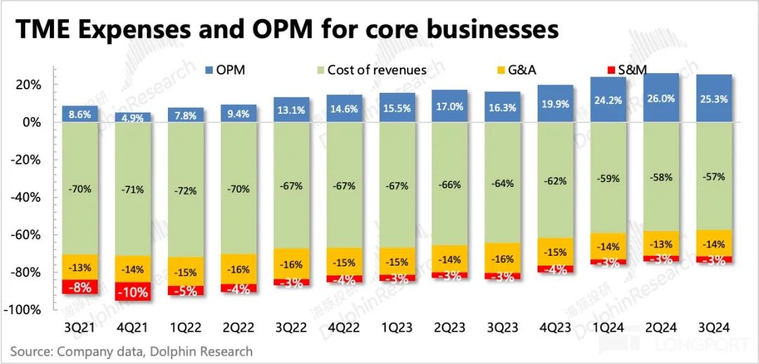 第三季度成本同比下降 5%,去年季度不高,所以减幅相对于第二季度有所收敛。除了直播业务下滑,相应的奖励分为下降的原因外,通过海豚君的拆分估计,订阅收入得以保持。 20% 随着上述增长,版权成本可能不会同步增加。但是与前几季相比,线下音乐活动带来了版权成本的增加。