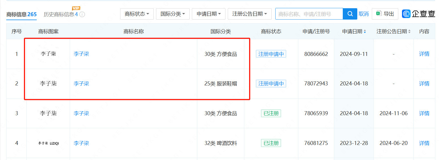 据天空调查数据显示,今年,子柒文化两次申请李子柒商标,包括速食食品和服装鞋帽。这是否意味着李子柒未来将再次收回“李子柒”商标使用权,自己做品牌,直播卖货?