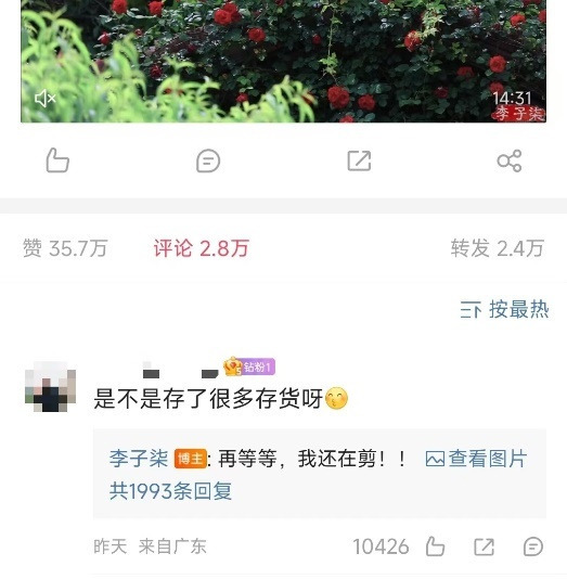 但是当粉丝问“你有很多库存吗?”李子柒也回答说:“等一下,我还在剪!!”这也是一个侧面的回应。在停车期间,李子柒确实有很多视频还没有发布。