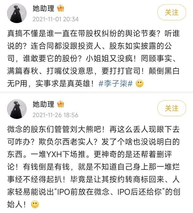 在此期间,李子柒的助理多次发布微博,将矛头指向微念。