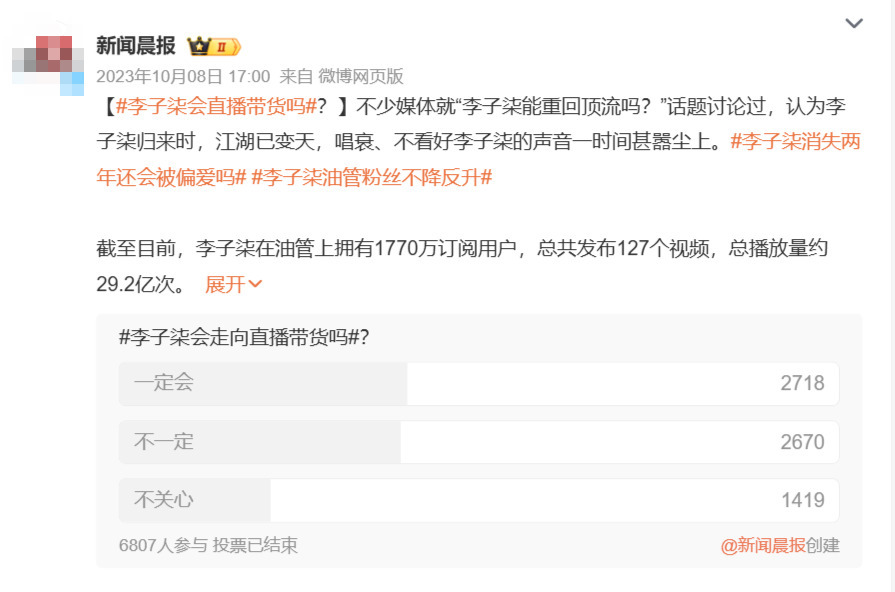 此前,微博就“李子柒会不会直播卖货”进行了话题讨论,超过一半的人认为“肯定会”。对于今天的网友来说,无论是前几天的瑞士卷事件,还是最近的劳斯莱斯女车主事件,大众显然已经开始ptsd带货这个词了。当他们着火时,他们会带货或故意制造话题带货,这使得“直播卖货”甚至开始贬值。