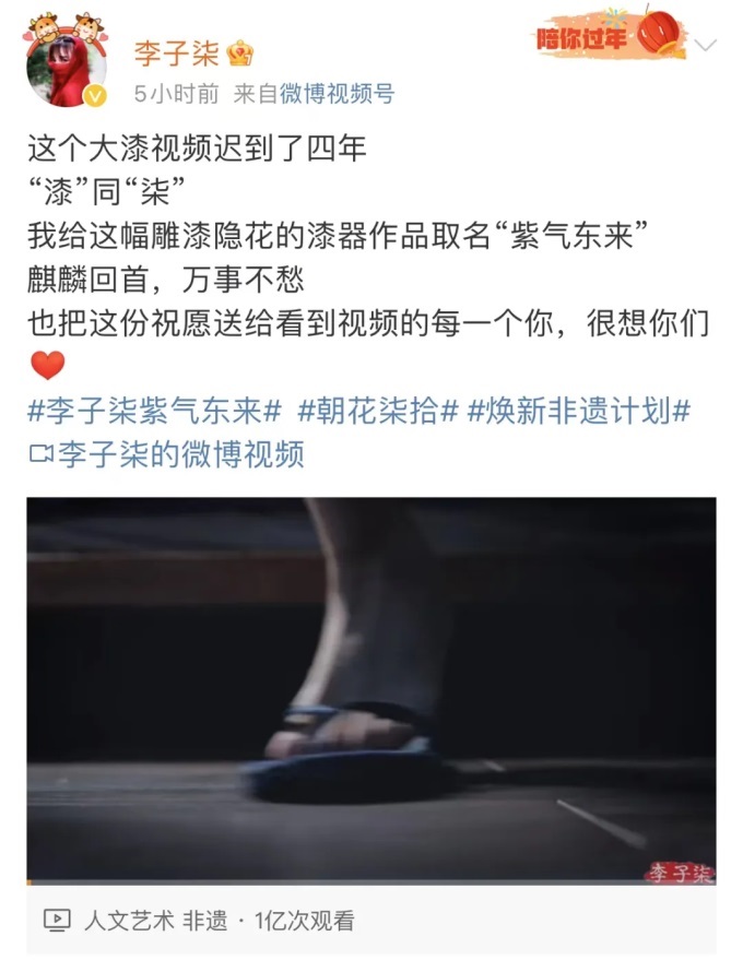 据悉,此次更新的李子柒视频名为《雕漆隐花,雕紫气东来》,并表示此次大漆视频迟到四年,“漆”与“七”相同,她将此次更新的视频名为《紫气东来》。