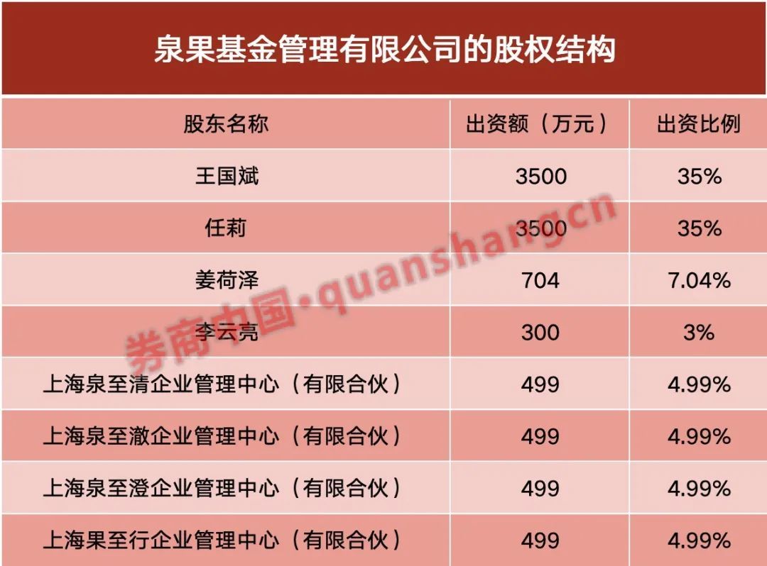 泉果基金的股权结构比较集中,主要由创始人和核心管理团队所有。在这些公司中,王国斌和任莉是主要股东,各自拥有35%的股份,姜荷泽拥有7.04%的股份,李云亮拥有3%的股份。另外,还有四家有限合伙企业:上海泉至清企业管理中心(有限合伙)、上海泉至澈企业管理中心(有限合伙)、上海泉至澄企业管理中心(有限合伙)和上海果至行企业管理中心(有限合伙)各有4.99%的股份。