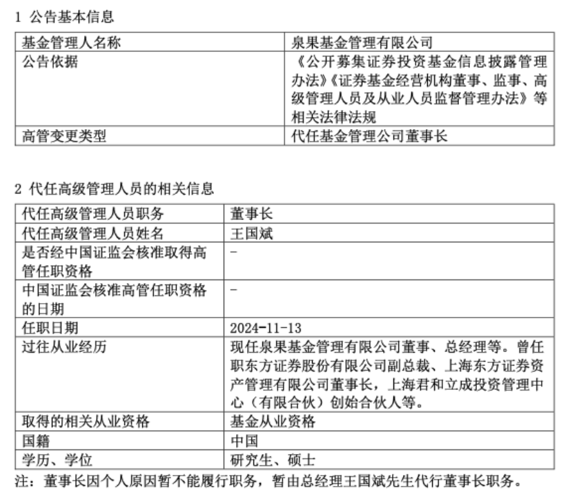 十一月十三日,泉果基金宣布,公司董事长任莉因个人原因暂时无法履行职位,暂时由总经理王国斌担任董事长。