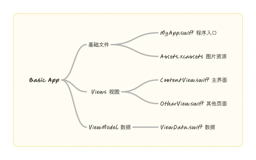 下一步,我放弃 Claude 讲述了一遍 SwiftUI 项目结构。例如 iOS app 图标应该放在哪里,页面是如何组织的,需要什么基本配置等等。经过多轮对话,我对一个有了初步的了解。 iOS app 基本结构。