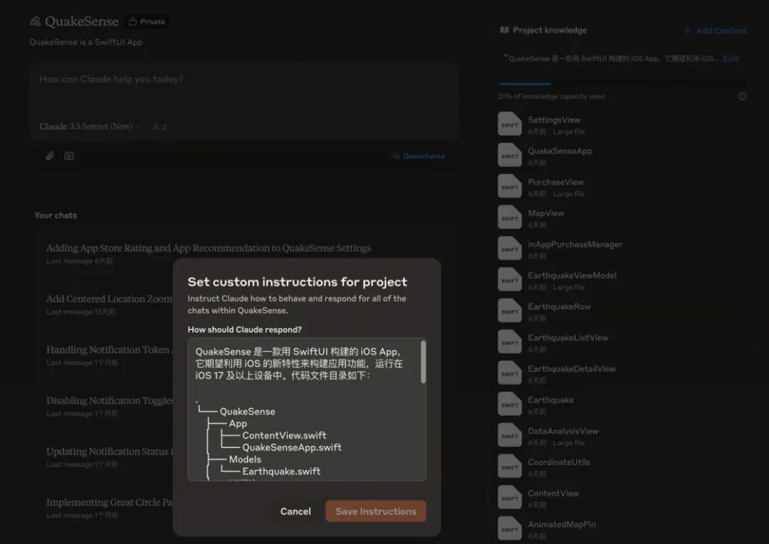 例如,在我上面的实际配置中,我会 Xcode 尽量将项目文件全部上传 Claude Project 中间。同时编辑好 Custom Instructions,在里面写下整个项目的目录结构和基本描述。就这样,AI 通过随后的对话,我们将了解整个项目的基本信息和完整结构。