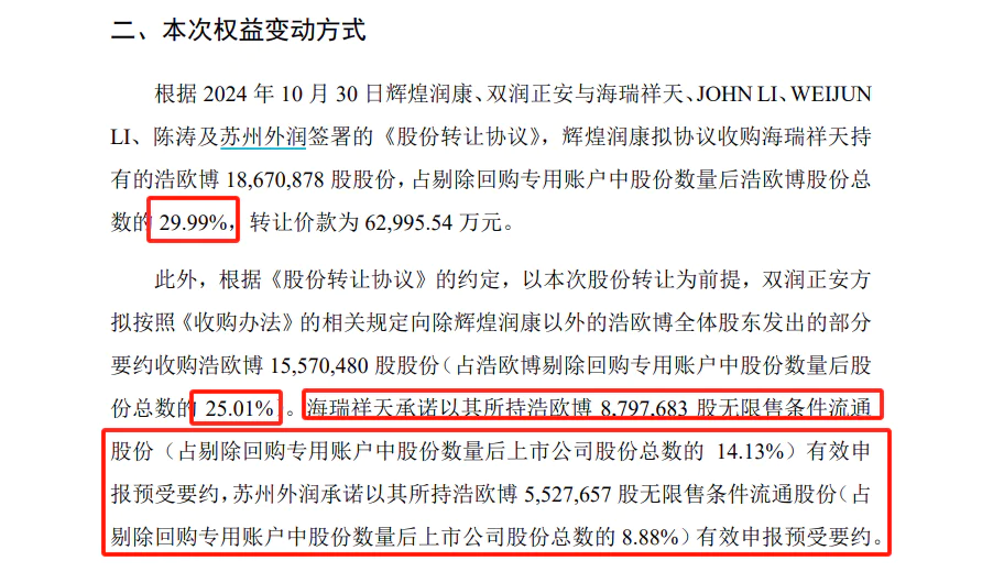 浩欧博在控股转让公告中火热起来。10月30日晚,公司发布公告,控股股东海瑞祥天及一致行动人与北京辉煌润康及其一致行动人双润正安签署《股份转让协议》。辉煌润康计划收购浩欧博29.99%的股份。股权转让后,双润正安将向全体股东收购25.01%的股份。