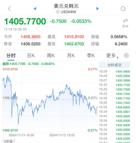 自特朗普再次当选以来,韩国股市每天都在下跌,在世界主要股市中表现最差。不仅是股市,韩元也遭受了沉重的损失,跌破了1400关口!这是自1997年IMF、2008年国际金融危机和2022年美国主导的加息冲击以来,第四次收盘汇率超过1400韩元。在没有重大经济冲击的情况下,突破1400韩元关口是极其罕见的。