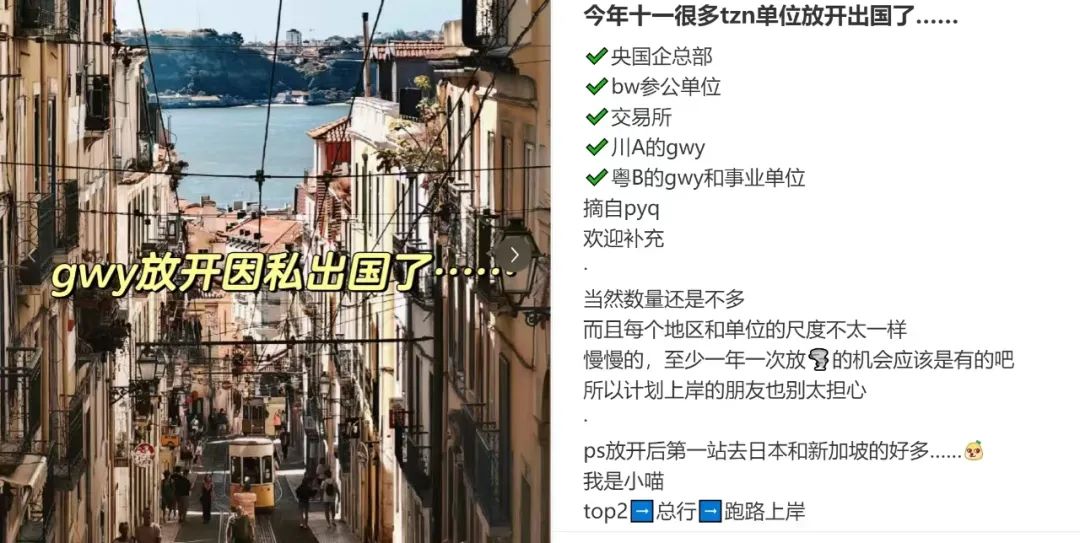 在社交媒体上,有网友统计了一小部分中央国企和体制内出国的单位,四川A的公务员、广东B的公务员和事业单位都在今年国庆节为出境旅游开辟了“绿灯”。