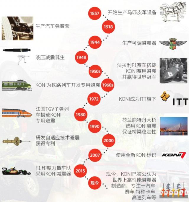 KONI 减震器首先要追溯到 1857 2008年,最早的创始人是为马匹提供相关配套设施的企业。后续 1918 2008年,我们开始为最早的汽车提供相应的支持。