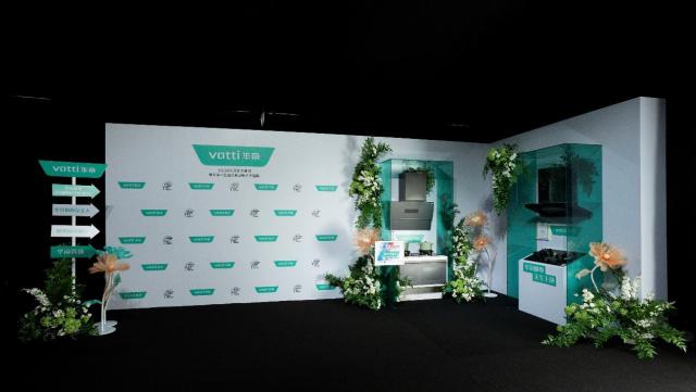 走进展区,内部空间设计非常出人意料。与恢复传统厨房空间的设计不同,华帝展示的厨房电器就像艺术品一样,被放入绿色玻璃格子中。周围环绕着优雅的白花绿植,营造出生动的自然氛围,让人由衷感受到治愈。