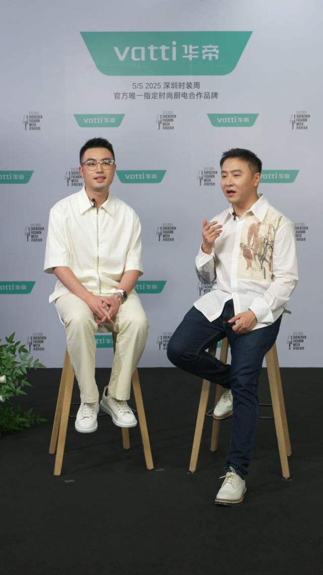 潘添和(左)和《男装》主编、时尚摄影师、制片人余凌远在华帝股份有限公司高级副总裁助理 S/S2025 深圳时装展现场